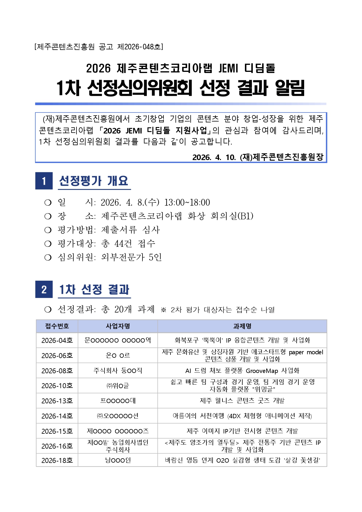 2026 제주콘텐츠코리아랩 「JEMI 디딤돌」 1차 선정심의위원회 선정 결과 알림 게시물 상세보기